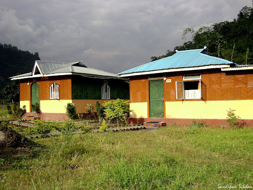 Facing east, on a raised stone platform, stood two octagonal cottages. They stood out with their shining tin roof and yellow wall with brick-coloured borders against the backdrop of a dense cluster of thick dark green pine and light green sal. The trees grew on a slope that climbs another 3,000 ft to a hamlet called Tunsung. The first rays of the sun touch the small balcony of the cottages. The rooms offered a wonderful view but only basic facilities.